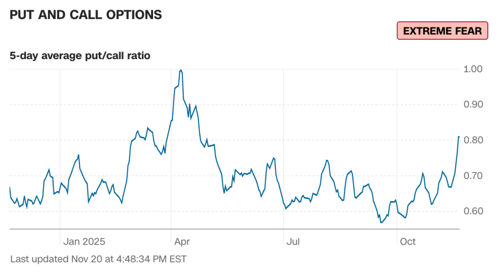 比例升高或大於1=投資人提高避險、偏向恐懼。