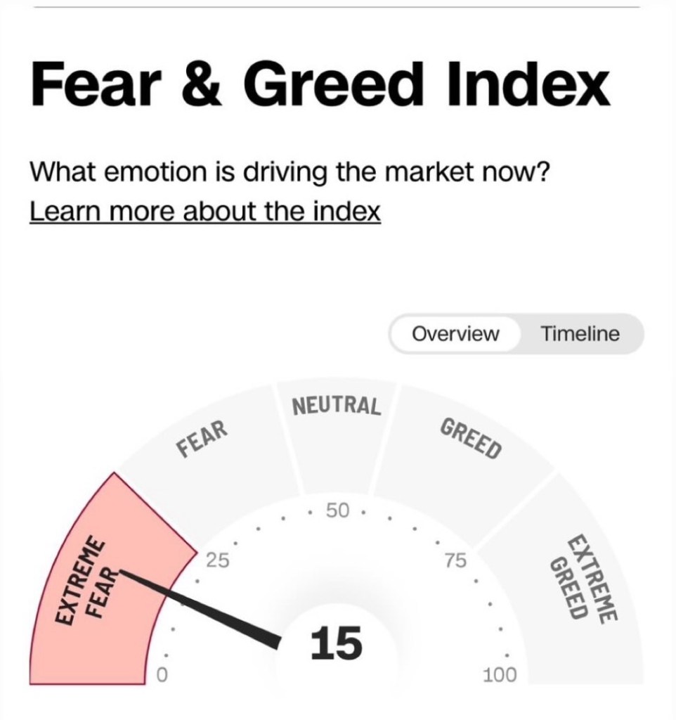 「CNN恐懼貪婪指數來到15極度恐懼」