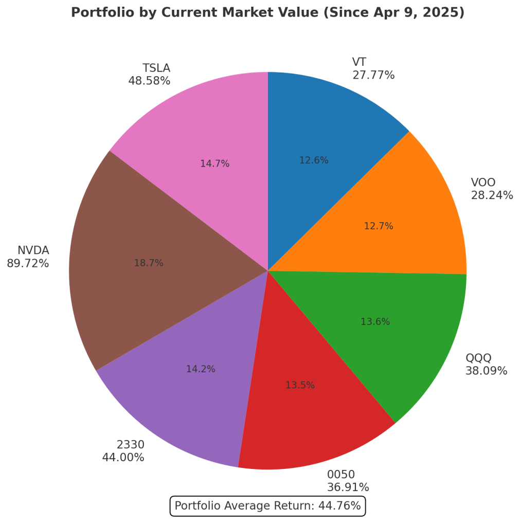 若你在4月9日投入30萬元,採用「平均分散配置」策略,平均分配上述4檔市值型ETF+3檔熱門個股。持有截至今,你的帳面獲利已達 134,271元,短短4個月總報酬率接近44.8%